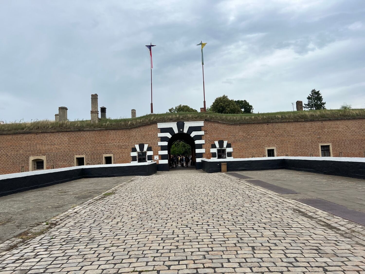 Vom zentralen Parkplatz aus führt der Weg am Nationalfriedhof vorbei durch eine Allee und über eine kleine Brücke zum Haupttor der Kleinen Festung.