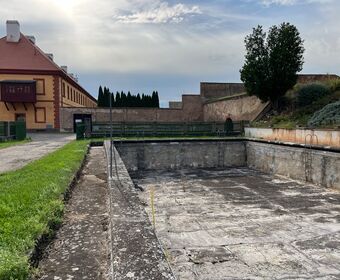 Linkerhand, gegenüber der Stirnseite des Herrenhauses, ist ein Schwimmbecken zu sehen, daß nicht etwa von den Häftlingen genutzt werden durfte. Unter dem Kommando des Aufsehers Soukup, der die Häftlinge systematisch quälte und drangsalierte, wurde dieses Schwimmbecken 1942 von Gefangenen unter schwierigsten Arbeitsbedingungen und ohne ausreichendes Werkzeug als Feuerlöschbecken und für die Badefreuden der Aufseherfamilien gebaut. Es waren vor allem inhaftierte Roudnicer Schüler, die diese Arbeit verrichten mussten. Einige verloren ihr Leben dabei.